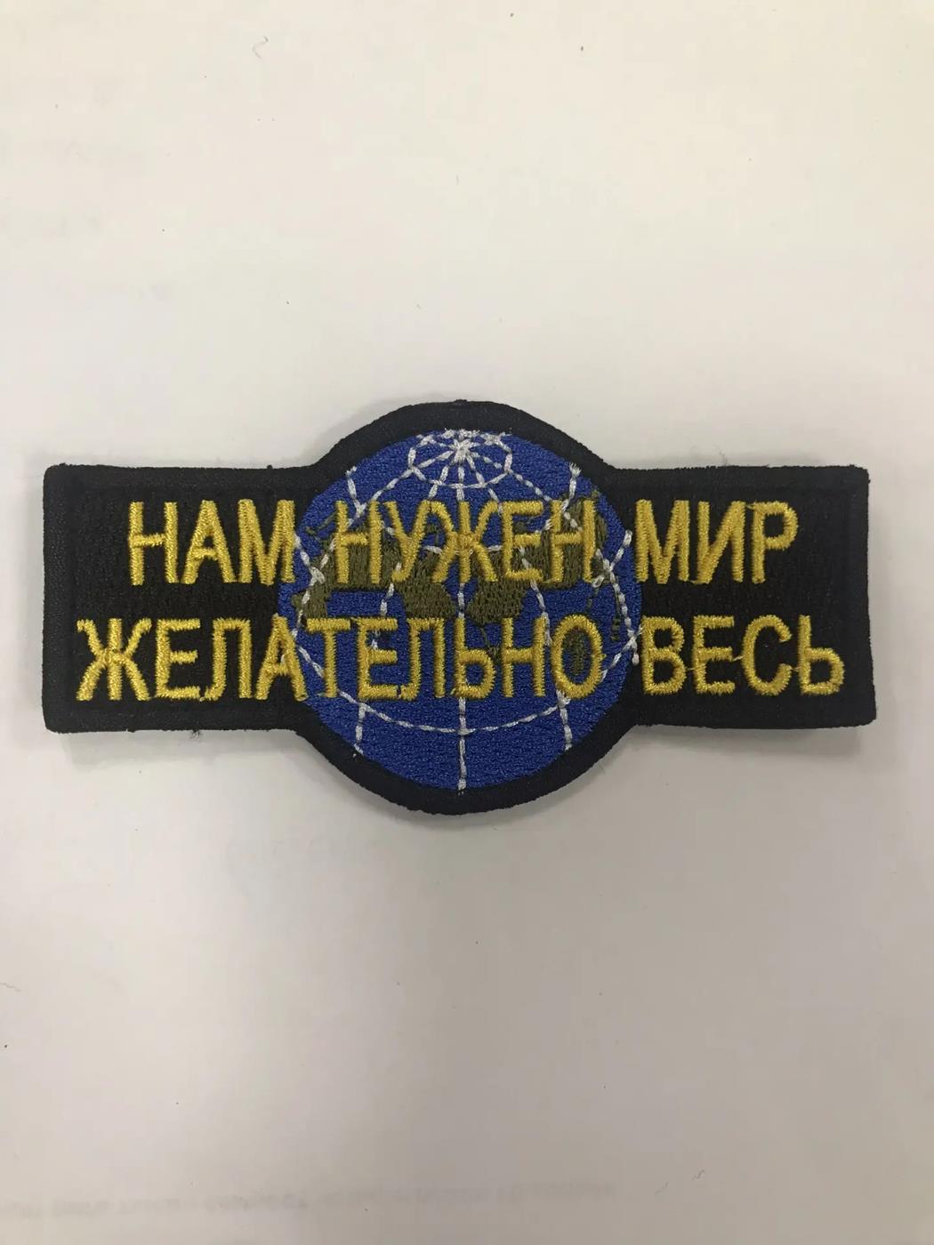 Шеврон с надписью "Нам нужен мир, желательно весь" на фоне голубой планеты. Размер 10*5 см.